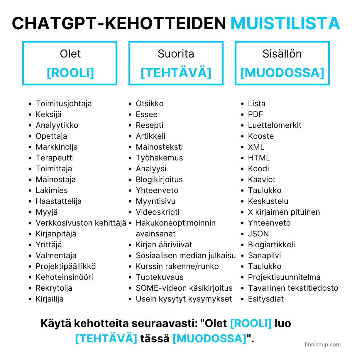 Esimerkkejä tehokkaista ChatGPT -kehotteista:
