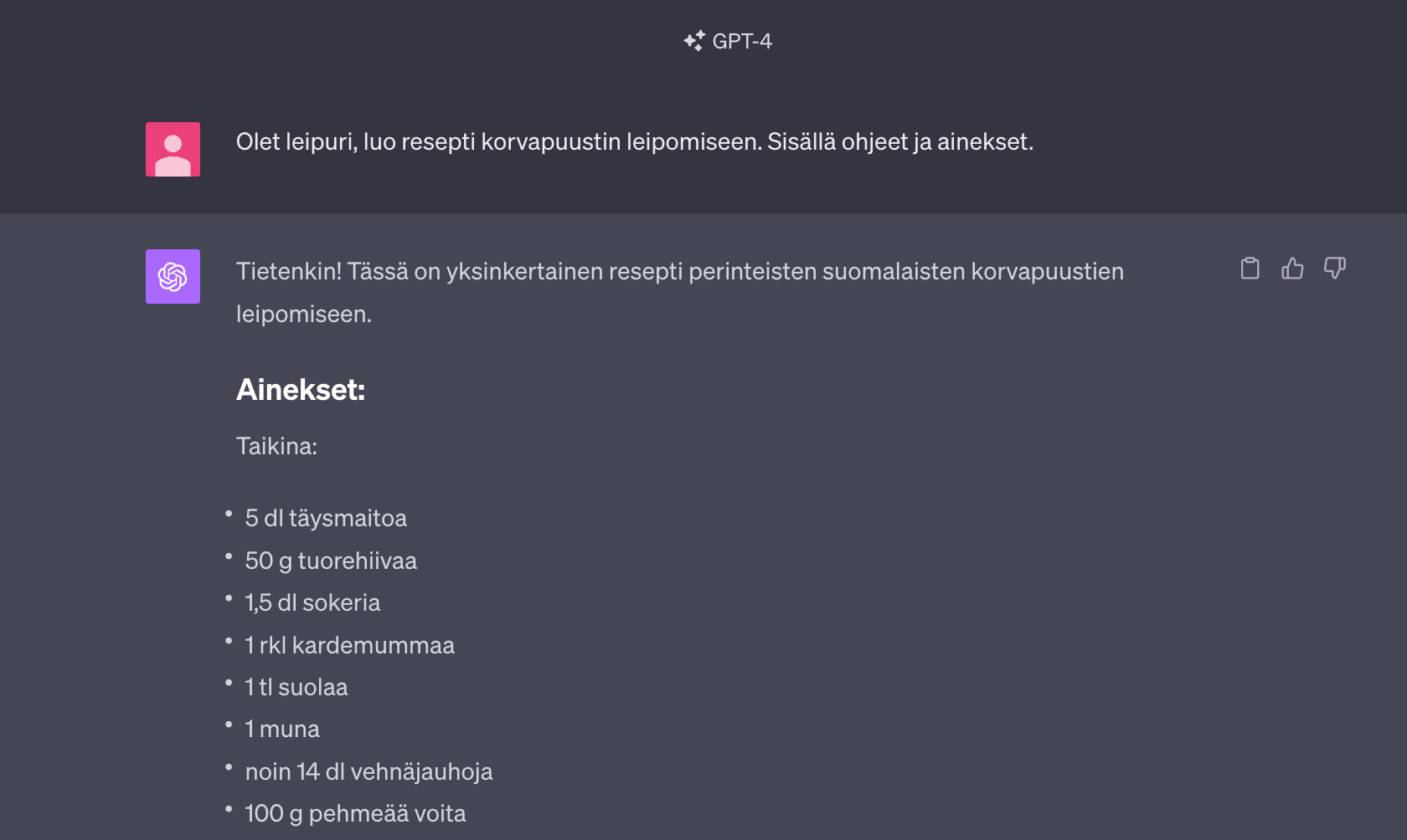 "Olet [Leipuri], luo resepti korvapuustin leipomiseen. Sisällä ohjeet ja ainekset."