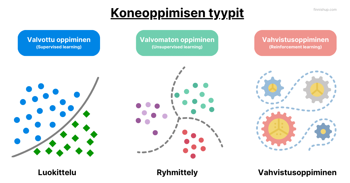 - Vahvistusoppiminen (reinforcement learning): Malli oppii tekemään päätöksiä kokemuksen perusteella saadakseen palkinnon.