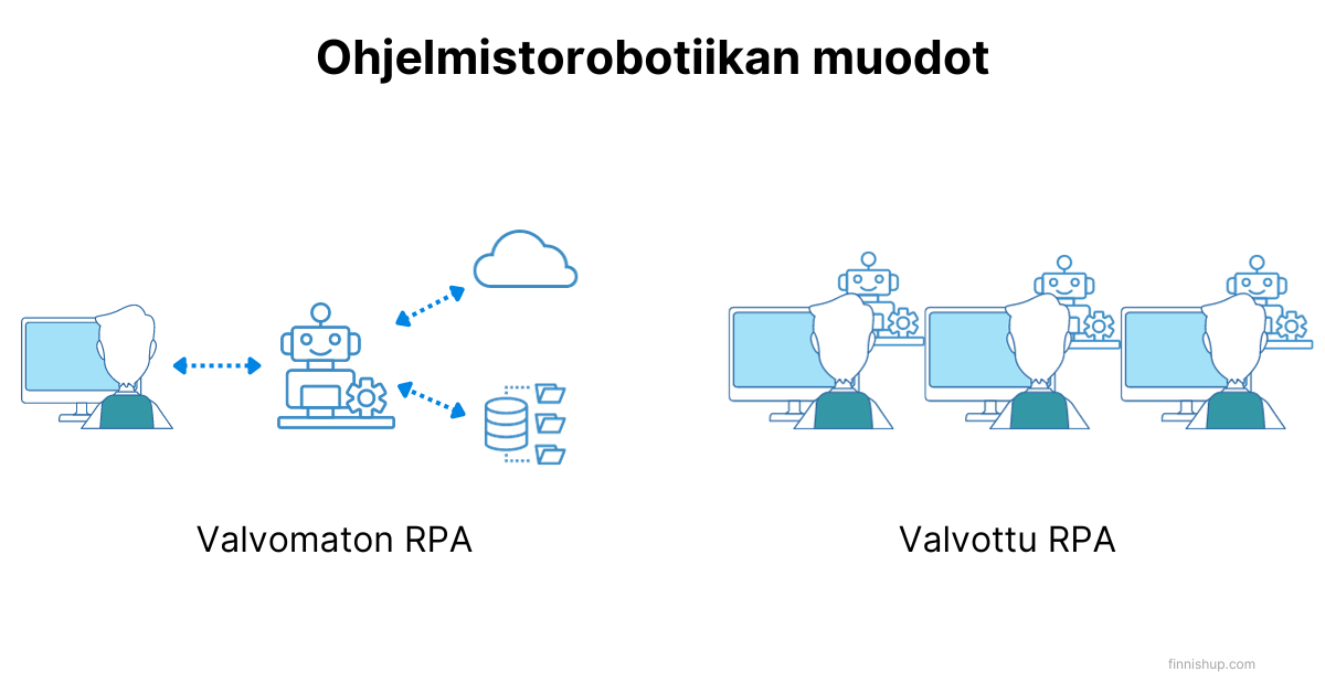 Toisaalta, valvomaton RPA toimii itsenäisesti ilman ihmisen välitöntä puuttumista, suorittaen tehtäviä ennalta määritettyjen sääntöjen mukaisesti.